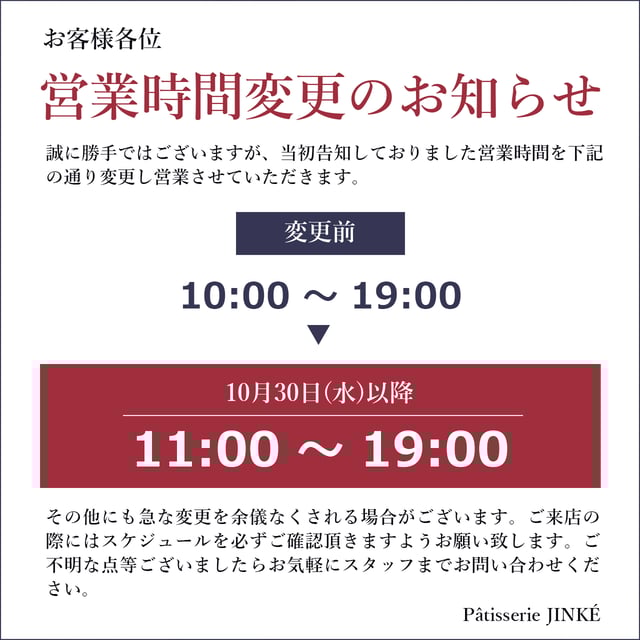 2019/10/24 営業時間変更のお知らせ プレオープンに際しまして、皆様の暖かいご支援とご愛顧賜りまして誠にありがとうございます。 誠に勝手ではございますが、当初告知しておりました営業時間を2019年10月30日(水)のグランドオープンより下記の通り変更させていただきます。 お客様には大変ご不便をおかけいたしますが、皆様にご満足いただける商品とサービスをご提供させていただけるよう努力させていただきますので、何卒ご理解いただきますようお願い申し上げます。 tagPlaceholderカテゴリ: